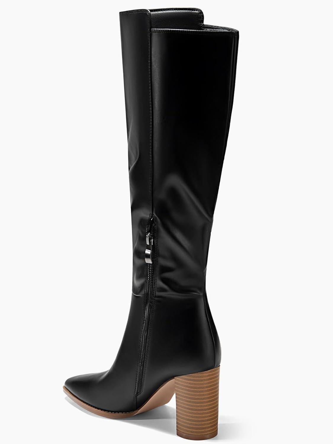 Juliet Holy Women’s Knee High Boots Stacked Block Heel Pointed Toe Riding Boots(Black)