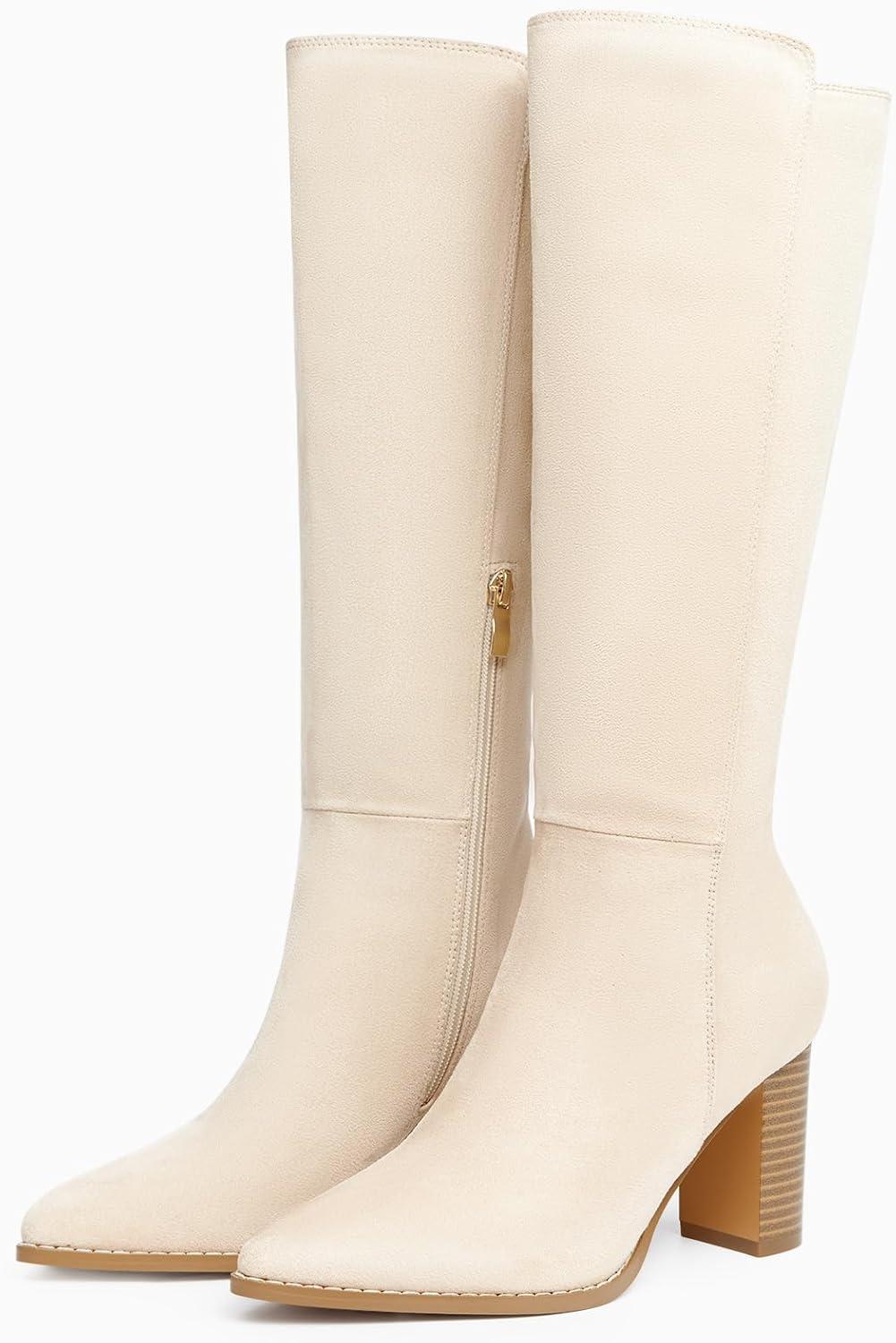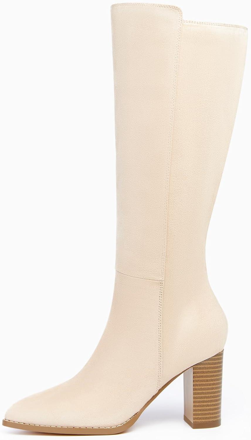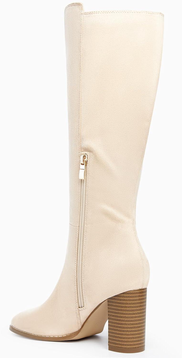 Juliet Holy Women’s Knee High Boots Wide Calf Stacked Block Heel Pointed Toe Riding Boots(Beige)