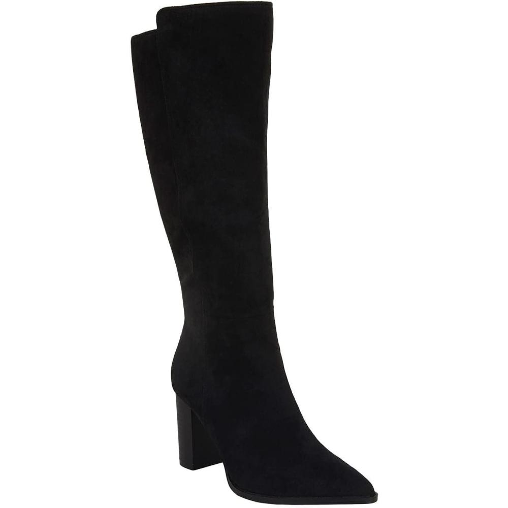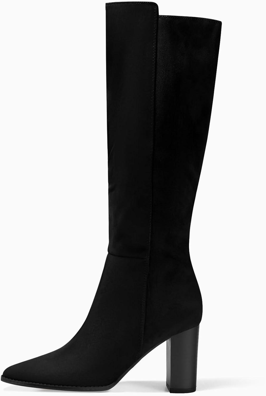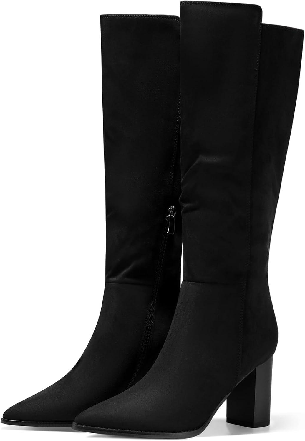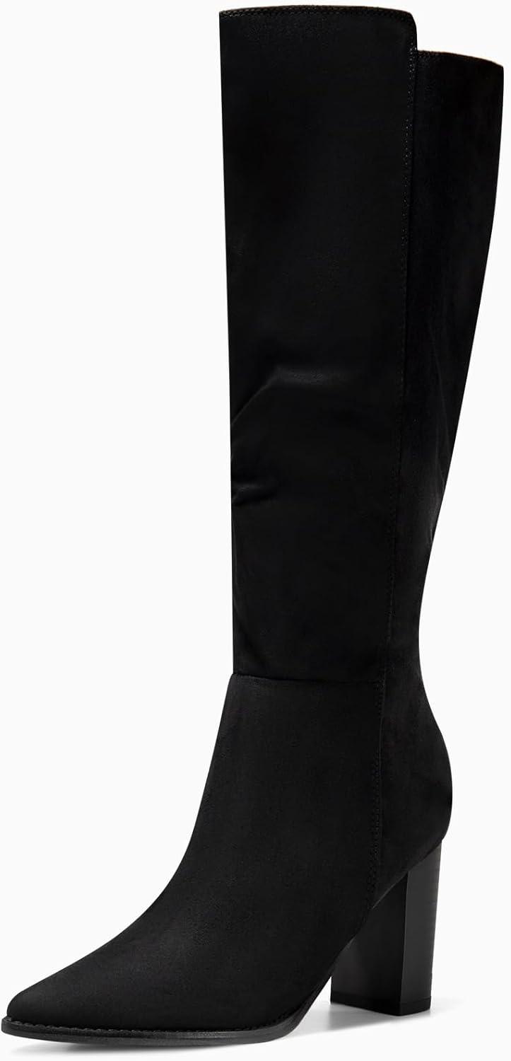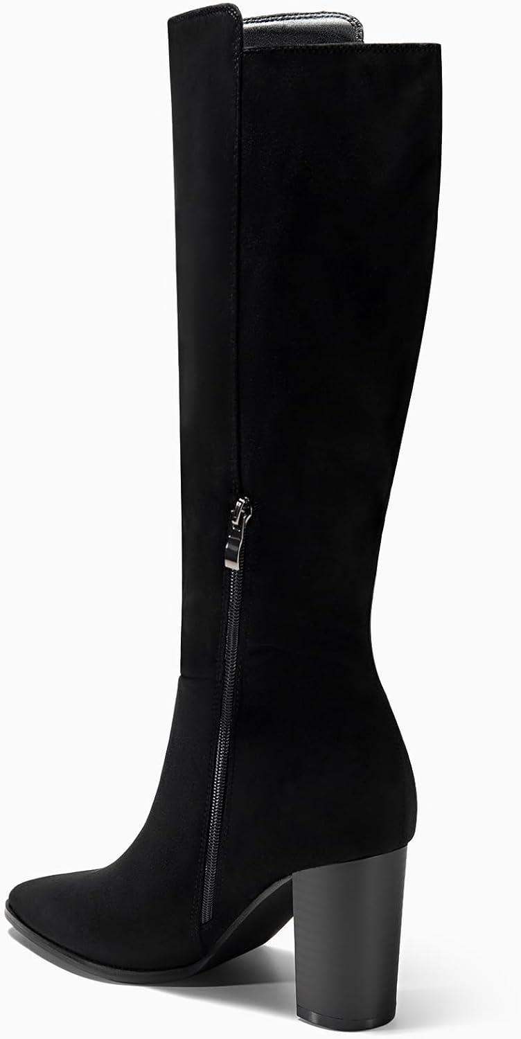 Juliet Holy Women’s Knee High Boots Wide Calf Stacked Block Heel Pointed Toe Riding Boots(Cool Black)